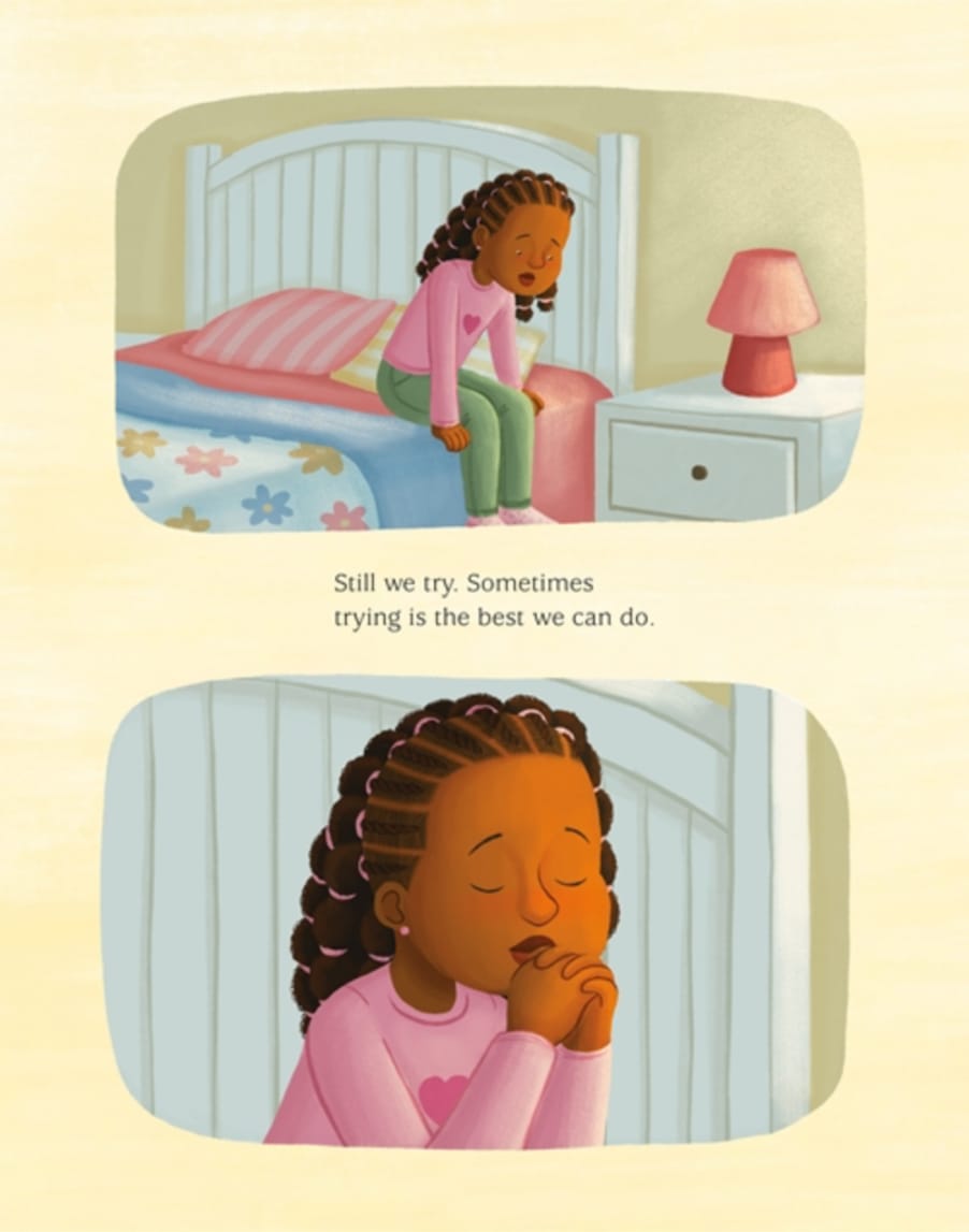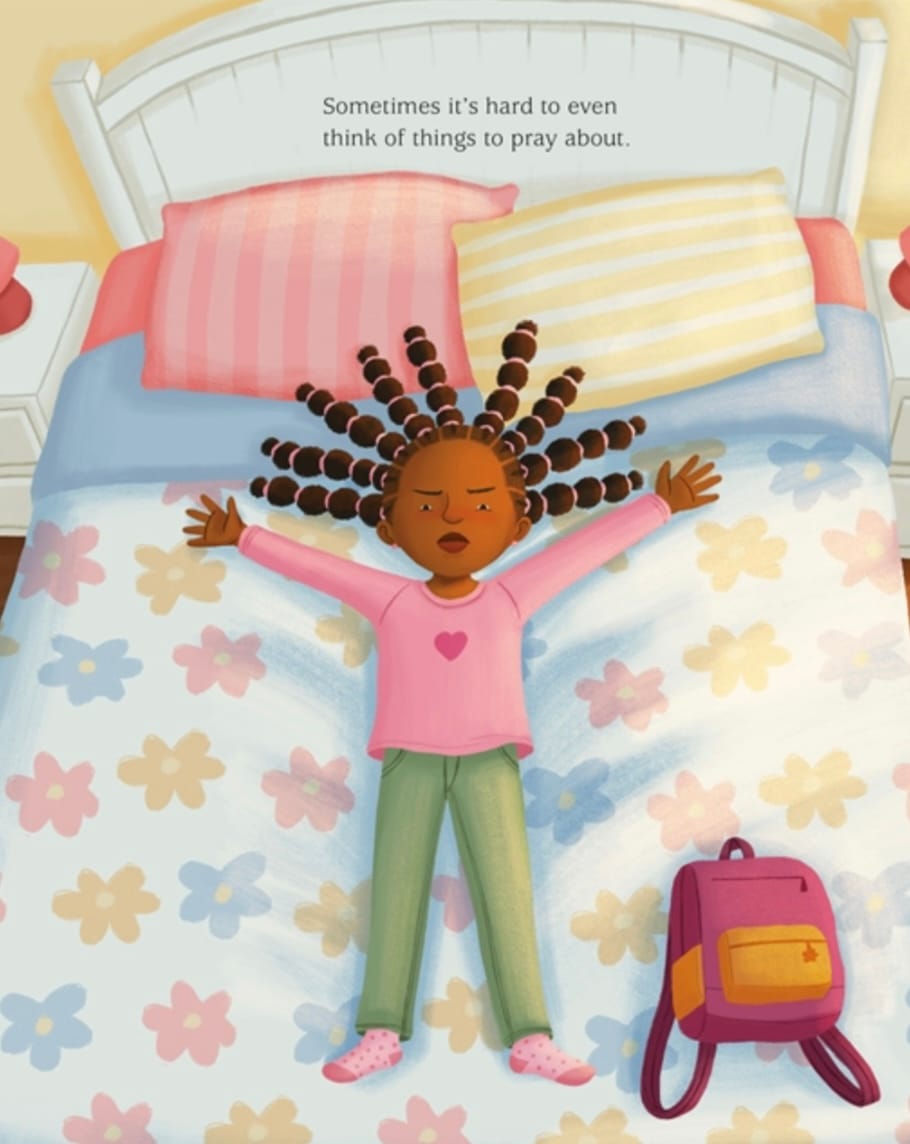 And while prayer can often come easily, the text suggests, it can also be challenging, especially 'when we're mad,' as in a scene that finds a child lying, frustrated, in bed. Through it all, the concept emerges as one component of connection to loving community–and 'a gift from God that everyone gets to use.... No matter who we are/ or what we do.' Characters are portrayed with brown skin."